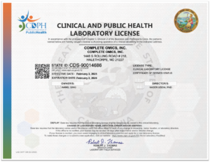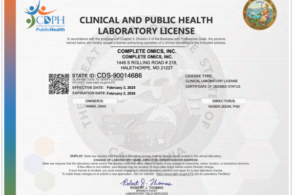 Feb 20, 2025 | BALTIMORE – Complete Omics Inc., a leader in clinical proteomics and multi-omics molecular diagnostics, proudly announces its recent achievement of the California Clinical Laboratory License. This milestone marks a pivotal expansion in the company’s ability to serve patients and healthcare providers across California, the most populous state in the U.S.