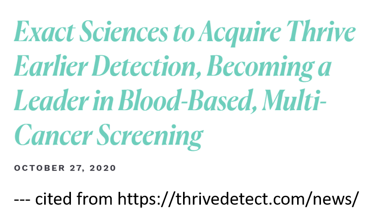 Thrive has raised $357 million in financing since its founding, including a $257 million Series B financing in July and a $110 million Series A financing in May 2019. Terms of the acquisition call for Thrive to receive total consideration of up to $2.15 billion, of which $1.7 billion would be payable at closing, comprising 65 percent in Exact Sciences common stock and 35 percent in cash. An additional $450 million would be payable based upon the achievement of certain milestones related to the development and commercialization of Thrive’s CancerSeek, a blood-based, multi-omic, early-stage, pan-cancer screening test.